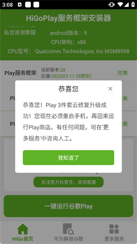 HiGoPlay服务框架安装器是一款帮助解决Google服务问题的专业工具。此工具与各种 Android 型号兼容,并且安装后可以顺利运行相关谷歌软件,同时还提供系统优化服务,让体验更加便捷。整体的界面简洁没有任何的广告,其操作的过程也十分简单没有任何复杂的内容在其中,帮助用户来实现手机使用谷歌相关软件的心愿。并且针对某些无法安装的机型也提供了一定的解决方案,让用户能够以最强制的方式来安装相关的服务进行使用,在手机上轻松实现打开谷歌进行使用的想法。