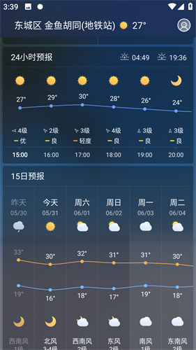 2、往下翻阅就是当日的具体24小时天气情况与15日的天气预报。