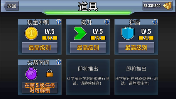 2、大量的道具将会随机出现在赛道上,利用金币来提升技能等级更快速的获取更多分数。