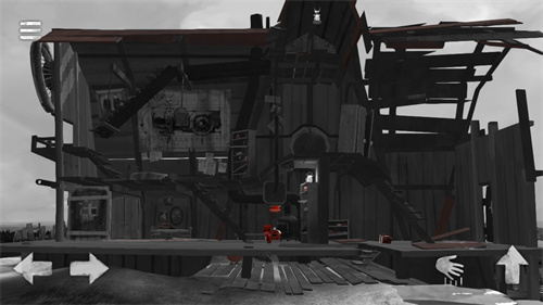 游戏不能说是画质好,说他画质好总觉得不能很准确地描述游戏画面的特点,我觉得更应当说这款游戏的画面色彩鲜明。背景中偏向灰白的色调雕刻出了一副末日之后荒凉的景象,而前景中游戏主角“小红帽”、按钮和可拾起物品鲜艳的红色则与背景的灰白产生了鲜明的对比,红灰色的主题色调使整个游戏的画面看起来很协调。