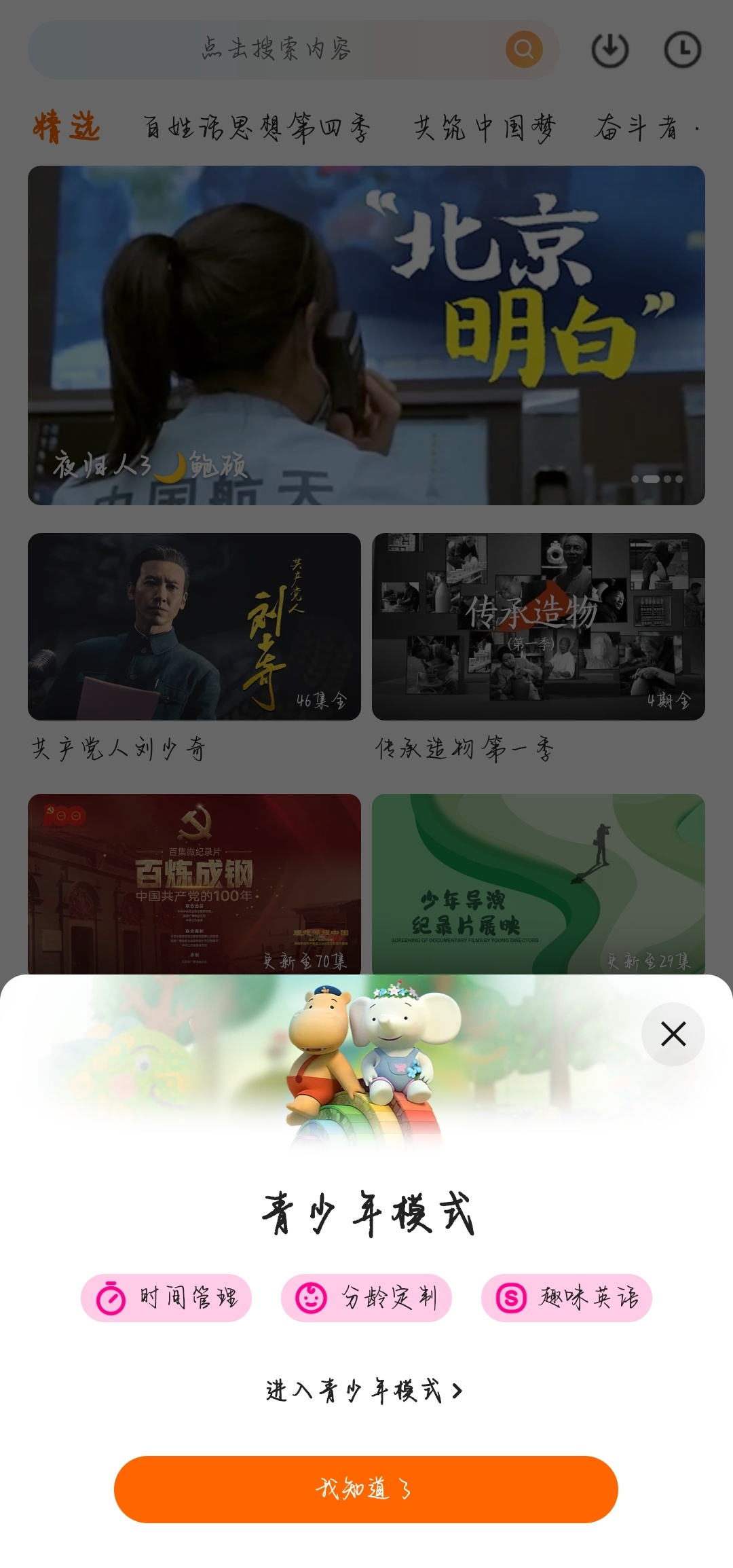 1、打开软件之后会一个青少年模式的弹窗,为了防止获取到一些不利于身心健康的视频内容。
