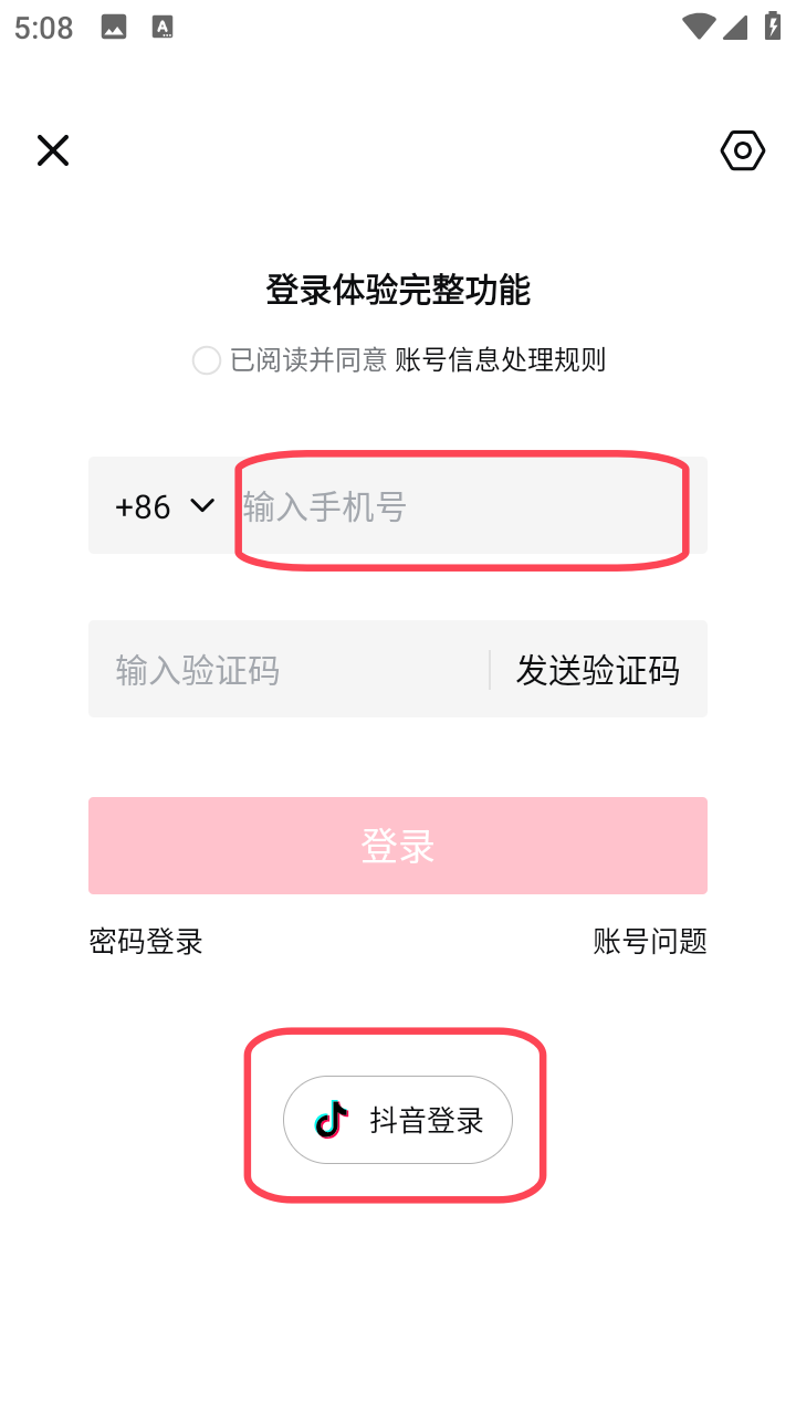 2、选择输入手机号获取验证码登录,或者直接用抖音账号进行登录