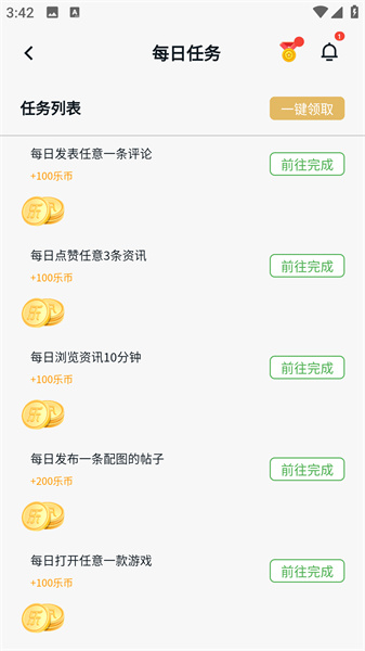 1、玩家可以在每日的任务栏中,点击一键领取来逐一进行完成获取乐币。