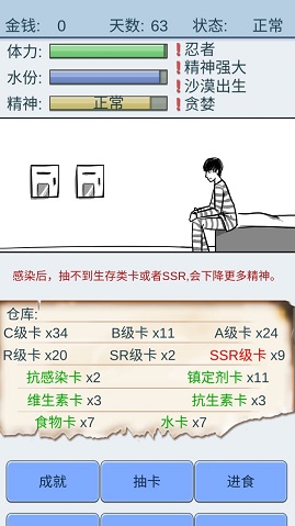 后期基本水和食物还有镇定剂屯的超过30时我就开始卖食物抽卡,抽到更多的食物卡,卖掉,打针,继续。滚雪球一般的攒钱。