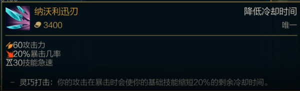纳沃利迅刃是新版才有的装备,被动效果跟以前的青龙刀有些相似,一个开大招后每平a一次减20%技能cd,另一个是暴击时缩减技能cd20%。并且纳沃利迅刃还提供高达30的技能急速,简直是我们这套出装的不二之选。