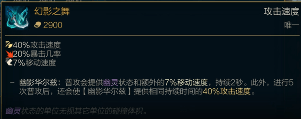 由于我们这套出装极其缺少攻速,所以这个时候新版幻影之舞的好处就出来了,新版幻影之舞在a5下之后就可以提供一个40%的攻击速度,弥补了攻速不够的问题。