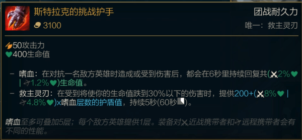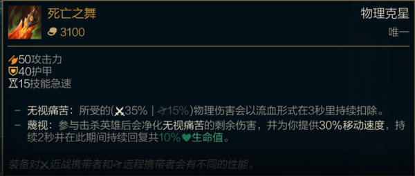 第三件是新版的死亡之舞,新版死舞减少了恢复能力,但多了个被动,只要杀人就能把之前所受到的无视痛苦伤害给清零,还能提升30%移速和回复10%生命,这两个属性对于剑圣来说大家都懂都懂,又是一个完美的收割利器。