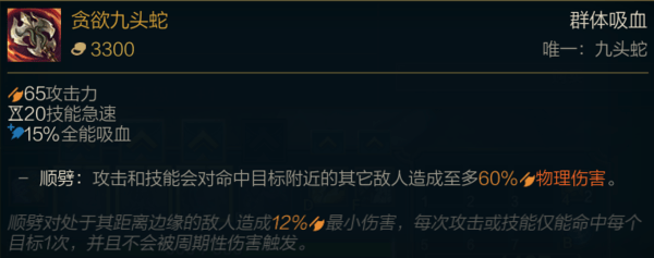 第二件装备则是九头蛇,九头蛇是我个人认为这个版本中的唯一真神,技能触发顺劈,20的技能急速还有15的全能吸血真的香的爆炸,一件装备的吸血效果就几乎能跟以前的羊刀征服者流相匹配了。这里我们选择第二件出来提升剑圣的续航能力,在中期的团战只要秒不掉,剑圣就能一直凭借高额的回复能力恶心对手。