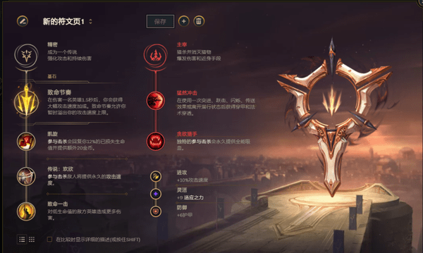 由于这套装备攻速过低,所以征服者的打法已经不再适用于我们了,因此符文方面我们选择致命节奏来提高伤害能力: