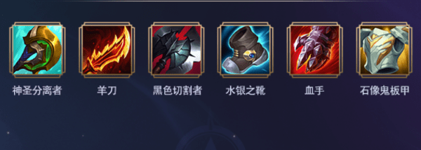 根据阵容对线合成鞋子、神圣分离者、黑色切割者,第四件根据对方阵容,若对方回复很多,可以出炼金朋克链锯剑,分带可以合成羊刀,第五件做出血手,最后一件神装直接出石像鬼板甲。