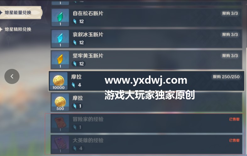 这次新活动我们的目标就是将蓝色经验书和紫色经验书和一万摩拉的限购全部兑换,一共需要1750的熄星能量。
