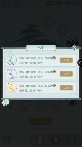 禅定:是升等级没到上限的技能用的,需要花钱,一天可以入定两次,每次一小时,心魔是敌方与自己属性一模一样的,打完无奖励。