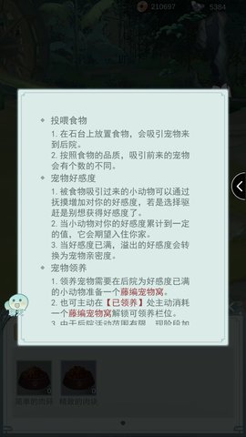 投喂食物:需要买食物(一种花铜板,一种花银子),可以吸引小动物,到了一定好感就能领养回家。后院点进去就是投喂。