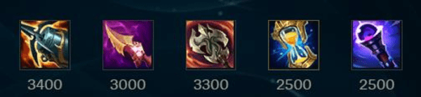 海妖可增加攻击力,攻速和暴击几率,被动会让其每第三次攻击造成额外的真实伤害,随着神话装备的具备不断获得攻速,大大满足前中期的作战能力。纳什之牙提供大量的伤害和攻速,巨九具备全能吸血效果,被动会让其在团战中更容易打出爆炸输出,中娅有利于团战的发挥,法穿棒让其输出能力更强。