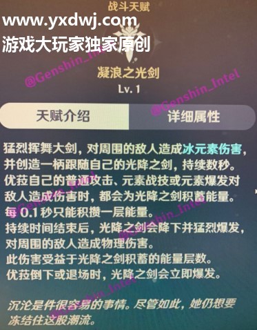 猛烈挥舞大剑,对周围的敌人造成冰元素伤害,并创造一柄跟随自己的光降之剑,持续数秒。
