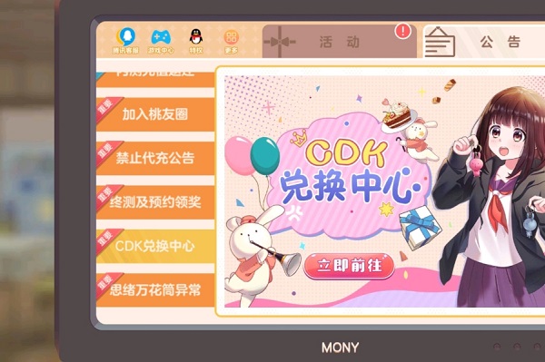 找到电视点击,然后看到公告点一下,去cdk兑换中心,直接输入兑换码就好了。