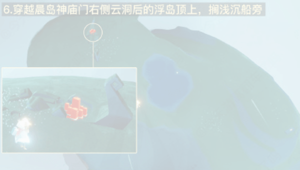 6、穿越晨岛神庙门右侧云洞后的浮岛顶上,搁浅沉船旁
