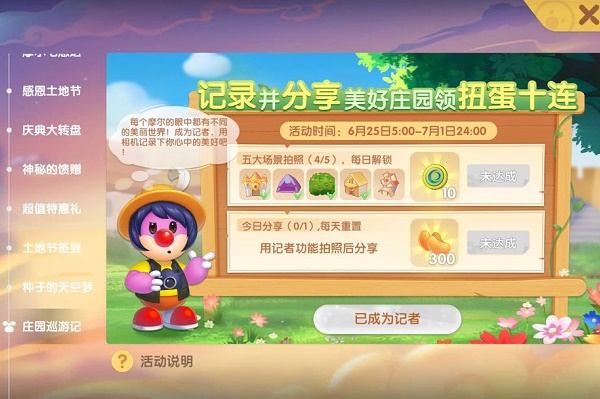 首先点开活动中的庄园游记的活动,然后点击游戏界面左边的拍摄素材任务,即可根据指引到达庄园。