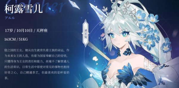 隐之国的王女。她从出生就背负着王族的命运,作为未来女王的人选,有着为国家奉献自己的觉悟,只懂得身为王女的责任和能力,丝毫不了解普通人的生活常识。日常生活中即使对常见的事物也抱持好奇之心,自己精通茶艺,但最喜欢的是杯装奶。