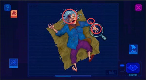 主角有两种视觉模式:1.普通视野;2.侦探视野。首先要在普通视野中调查下图3个位置,获得线索。