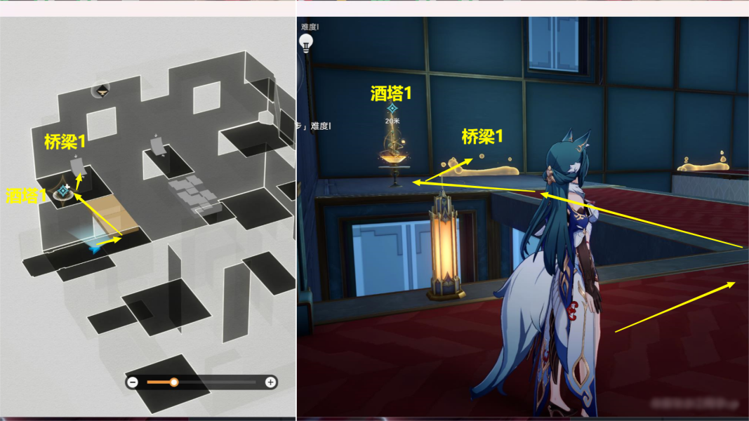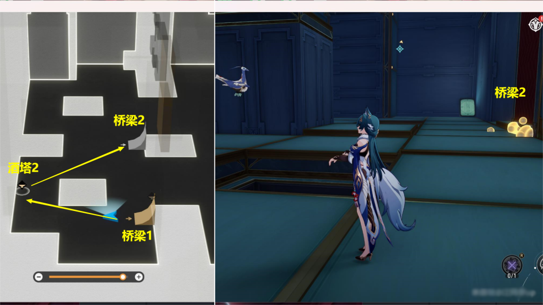 (2)从【桥梁1】上来后,去前面【酒塔2】获得次数后,从【桥梁2】上去。