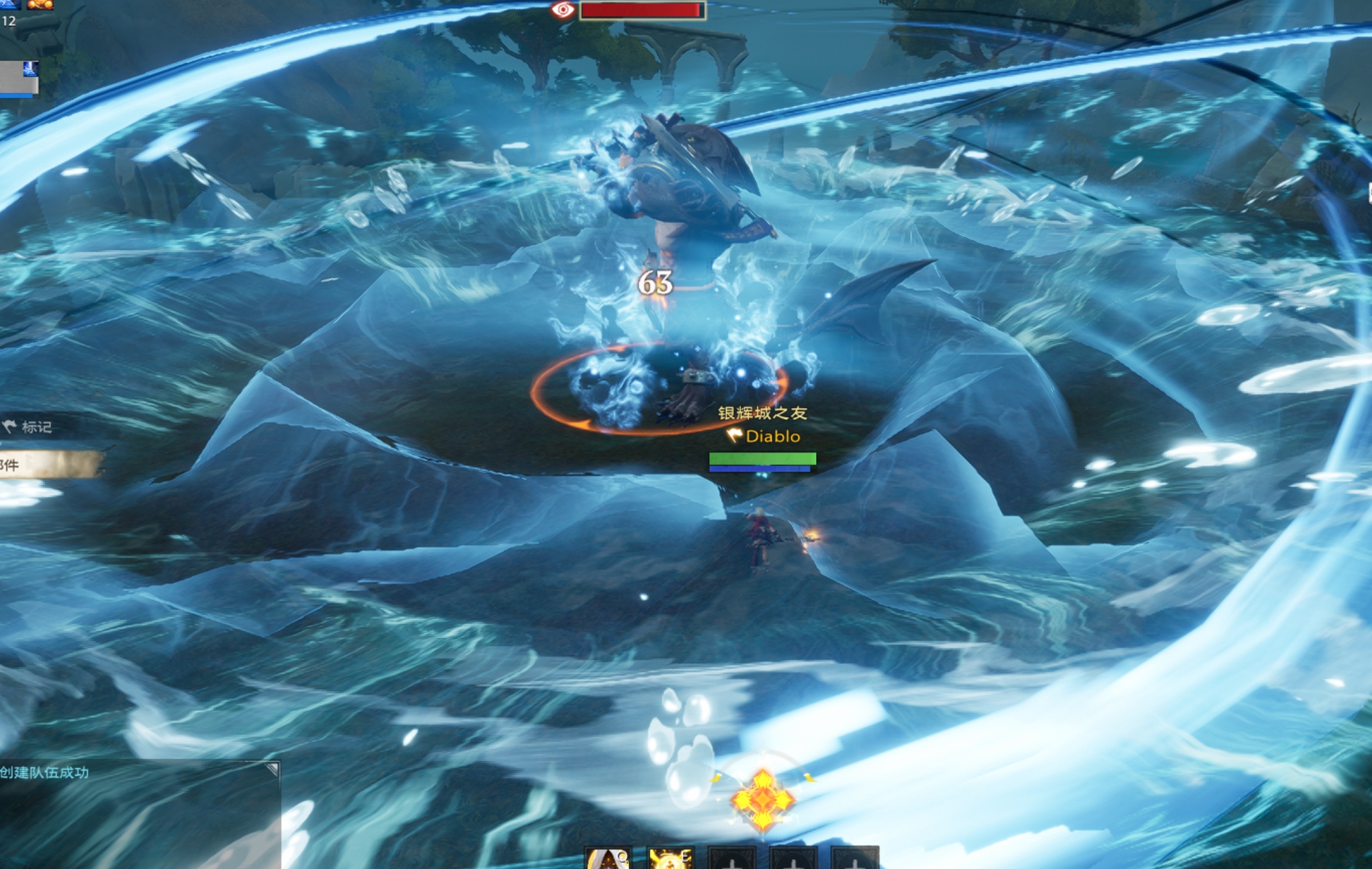 2、整体流程:“重击强打”>“激流冲击”>“波涛冲击”>“召唤鱼人(右侧小怪)”>“重水炸弹”