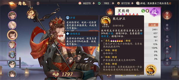 3、黑熊精:能提供巨额全队的护盾,以及被动可以免除致命伤害一次在前中期就有不错的游戏体验。