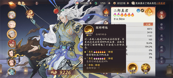 5、杨戬:杨戬大招技能释放后提升自己的一个50%攻击和60%防御,外加上二技能会回复攻击80%的一个血量,使用大招技能再释放二技能即可使其会有一个非常不错的输出环境和一个自保能力。