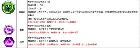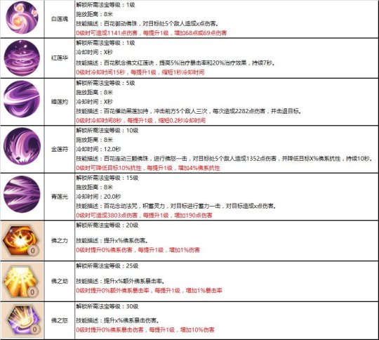 灵珠加点:处于提高治疗量的考虑,建议大家优先点满“红莲华”来减少其冷却时间,进而使我们可以更频繁的获得治疗量提升的加成,之后我们可以点满“暗莲灼”,通过更频繁的击退敌人来提高自己的生存能力,之后大家可以酌情点满“佛之力”、“佛之劫”和“佛之怒”来提高自己的输出能力。
