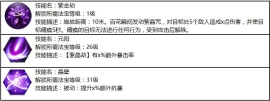紫金梭加点:推荐大家先点满“晶壁”来提高抗暴能力,进而提高生存站场能力,随后点“元阳”和“紫金劫”来进一步提高输出能力。