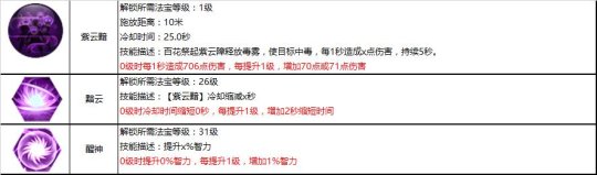 紫云瘴加点:处于对基础属性加成的考虑,推荐大家先点满“醒神”来获得5%的智力加成,随后点满“黯云”来获得10秒的冷却缩减,这样一来,对方就会时刻处于我方紫云黯的笼罩之下,最后点满“紫云黯”来提高技能伤害。