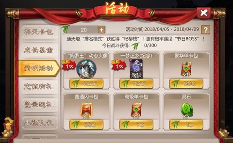 清明节,古代有插戴杨柳枝的习俗。在通天塔排名模式下的战斗中,获胜即可得到杨柳枝,能用来兑换“一梦还乡”,以及动态头像“阎罗王”,以及单卡包、灵石等等。