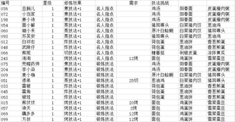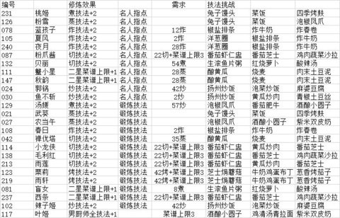 倒数第四列是什么呢?是将三道菜谱做到神级还需要补上的技法值,大多需要靠厨具才能补齐,但仔细观察我们就会发现,部分厨师缺少的技法值完全可以靠修炼获得,不需要碎原有的厨具,也就是说提前修炼一部分厨师会给后面的修炼提供帮助,我们的修炼思路就从这里出发。