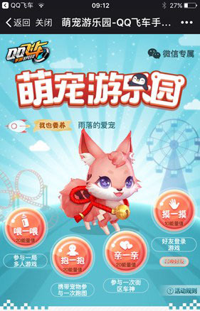 在微信活动页面可以看到玉面狐,这就是我们活动中要养成的宠物了,在宠物下面有“喂一喂”、“抱一抱”、“亲一亲”、“摸一摸”这些按钮,点击这些按钮就可以给宠物增加能量值。