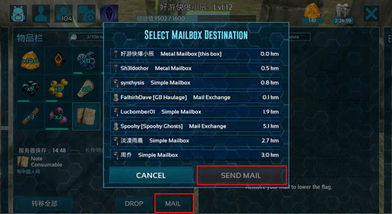 三、靠近邮箱打开背包,选择信纸,它会显示一个mail选项,点击后,系统会跳出区里的邮箱列表,选择你要发送的邮箱,点send mail,邮件就会发到对方邮箱里边了。