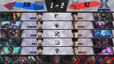 13分钟Falwless遭遇KZ多人包夹,PraY上前接上伤害拿下一血;前期RW由于下路被推线导致野区被Peanut掌控,而RW突然于11分钟组织了一波四人越塔将KZ下路双人组击杀,双方在一血塔的竞争中由KZ占先率先推掉中路一塔并控下土龙,而RW作为交换斩获峡谷先锋,双方至此陷入僵持,20分钟经济基本持平;中期双方持续交火却并未有一名取得决定性优势,直到32分钟双方为争夺土龙爆发终级团战,Doinb绕后进场完全冲乱KZ阵型,Smlz死歌唱出大招将KZ双C全部击杀,RW打出0换3大获全胜,从下路长驱直入一波终结了比赛。