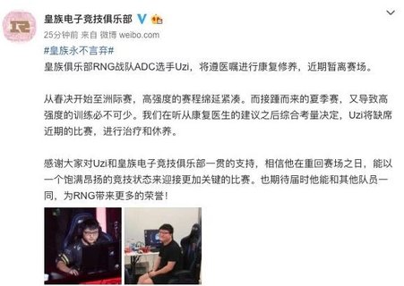 根据皇族俱乐部刚刚发布的官方消息透露,由于从春季赛、MSI、洲际赛期间uzi一直都处 于高强度的训练以及比赛中,所以综合医生给出的建议,俱乐部绝对让uzi暂离赛场去休养, 虽然RNG并没有给出具体uzi的回归日期,但从话语中可以听出不会太久!