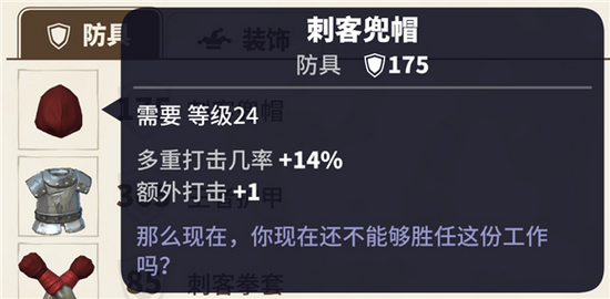 最重要的就是刺客兜帽+闪亮战斗戒指的两次额外打击以及+24%的多重打击几率