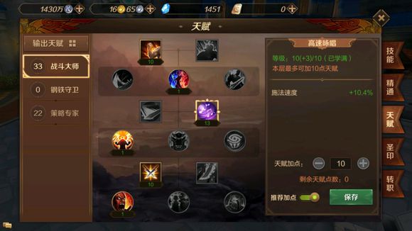 这层天赋显而易见狡诈是作为纯输出的最佳天赋,理论上能够提高输出评分也是最高的;但是在PVP活动中,适量地选择轻灵这项天赋可以大大提高你的容错率,说不定就应为你比他多个百分之几的移动速度,你就把他追上杀了或者逃命升天。