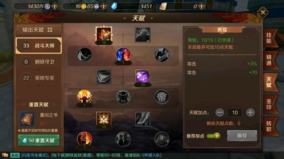勇猛 每一层可以提高你的攻击力数值和百分比,10层分别+3%攻击和+70攻击