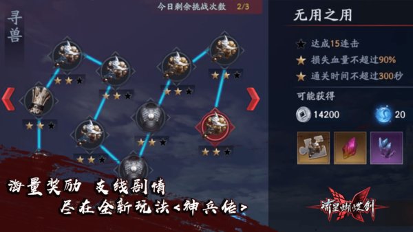 全新玩法【神兵传】即将与少侠见面!每日通关<神兵传>,均可获得武器碎片、升星材料,除此之外,星级宝箱也有丰厚奖励,升星材料、武学秘籍、生涯点数,同样等待少侠前来领取!