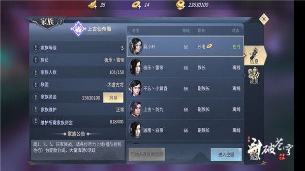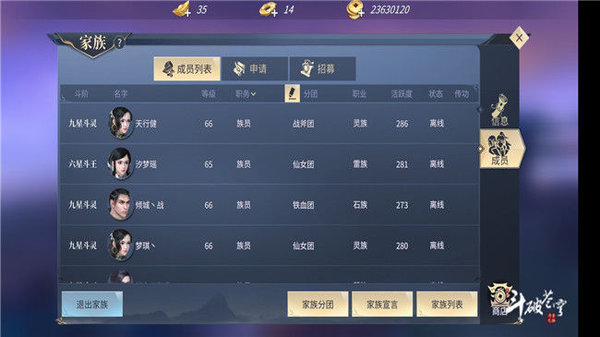 当然大家族也有大家族的好处,比如做任务、活动、副本啊什么的都是比较方便的,没事的时候家族还有一大帮兄弟陪你聊聊天南地北、人生理想什么的,也是非常有意思的。