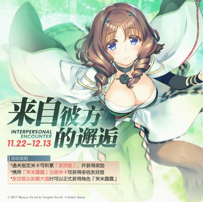 1.限时开启联动活动「前半:来自彼方的邂逅」,活动时间:11月22日维护后~12月13日,通关指定关卡累计「友好度」,可获得角色「芙米露露」;
