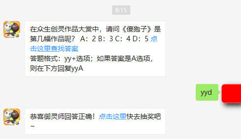一起来捉妖微信每日一题2019年5月23日问我们:在众生创灵作品大赏中,请问《傻狍子》是第几幅作品呢?参考的参考资料中我们可以打到正确答案是第5副作品,投稿师是投稿御灵师:@君宝,所以正确选项是YYD.
