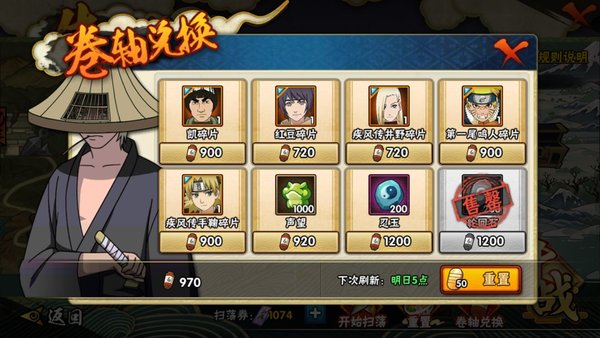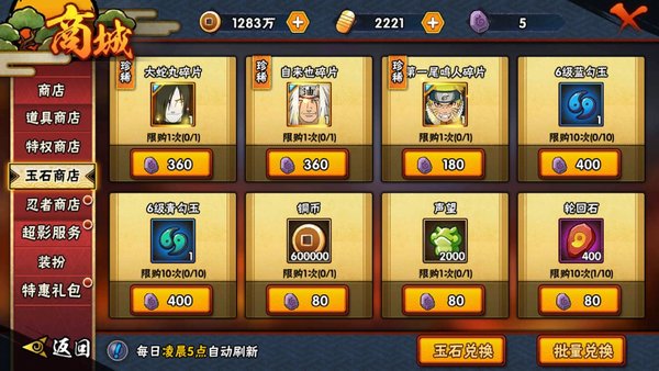 拥有五星忍者之后会开启玉石商店,五星之后溢出来的碎片可以换成玉石,玉石换轮回石
