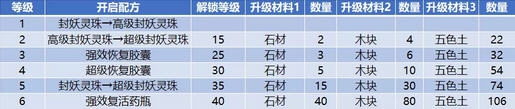 当然,御灵师也可以点击“升级”按钮,对天工树进行升级,解锁更多的配方。所需的材料以及升级效果马博士同样为大家整理在下方图片中。
