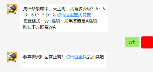 微信一起来捉妖每日一题5月27日的题目也是问我们【策划带你周游集会所】里面的信息,这一题目问集会所攻略中,天工树一共有多少级?参考资料中有正确答案是yyB