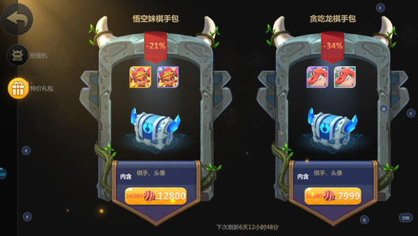 1.悟空妹礼包:悟空妹传说级的棋手加上悟空妹史诗级的头像,以前想要获取一个传说人物你要非常好的运气去扭蛋里面抽取现在就可以轻松入手,外形也非常的别致,就像西游记里的大师兄骑着二师弟非常有趣,快来购买吧这么好入手的传说棋手可不多。