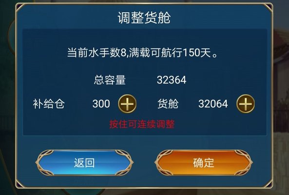 出门前,取消自动补水手,将多余水手开除,只留下一人(保证两个仓一天即可)。