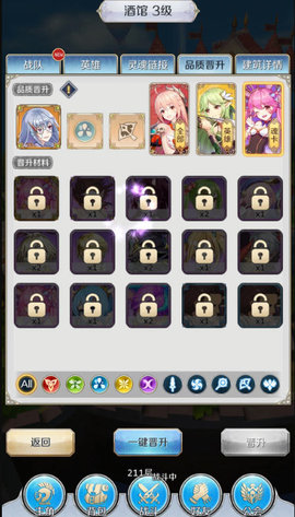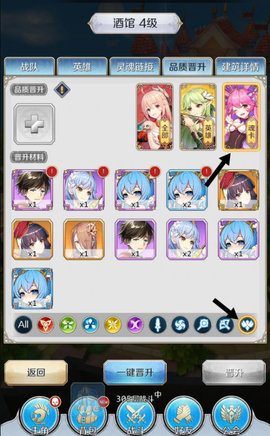 如图所示,尼采升红需,职业为射手的橙晋升一次的魂卡,水属性橙晋升一次的魂卡。下面有筛选,点击筛选即可筛选出魂卡。建筑容量升级,个人会把钻石,结晶还有经验药水的容量升满。武具锻造,在前期不要用太多材料。有了紫之后适当锻造一些。